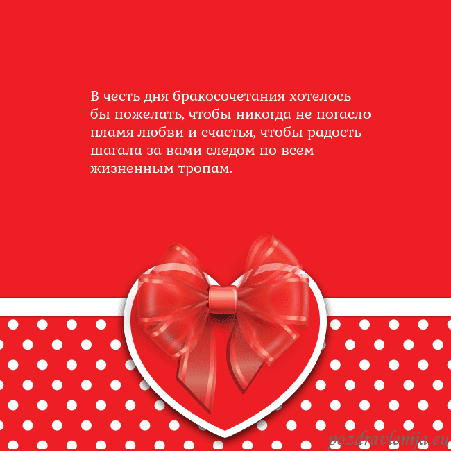 В честь дня бракосочетания хотелось бы пожелать, чтобы никогда не погасло пламя любви и счастья, чтобы радость шагала за вами следом по всем жизненным тропам.