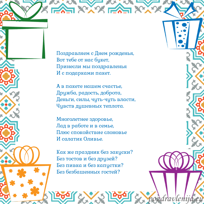 Прекрасно, когда для виновника торжества гости подбирают душевные и лично ему адресованные поздравления. В наш век технологий всё чаще близкие и друзья поздравления с днем рождения отправляют SMS-сообщением, по электронной почте или пожеланием в социальных сетях. Те бумажные открытки, которые еще совсем недавно мы отправляли по почте, все чаще заменяют открытки, высылаемые по почте электронной. Выбор открытки или поздравления ко дню рождения зависит от именинника, его возраста, увлечений, мечты.Для молодежи, детей, очень близких приятелей подходят смешные, юмористические поздравления, для более солидных, зрелых юбилеев поздравления подбираются более серьезные, с глубоким смыслом. В зависимости от случая может быть достаточно короткого поздравительного текста с искренним пожеланием, предназначенным для конкретного человека, иногда более подходящим бывает стихотворное поздравление. Поздравительные тексты, которые предназначаются для любимого человека, могут быть сексуальными, с эротическими намёками.Для поздравления детей подходят веселые четверостишия. Взрослые дети, поздравляя своих мам, чаще всего благодарят их за то, что мама их вырастила, заботилась о них, желают маме, чтобы та нашла время для отдыха и для себя. В основном, чем ближе человек, которого поздравляем, тем более личным бывает поздравление. В текстах поздравлений по случаю юбилеев часто упоминается количество прожитых именинником лет, делается акцент на достижениях юбиляра.Наверное, не зря существует поверье, что сказанные на дне рождения искренние, индивидуальные пожелания сбываются. Поэтому пожелание, предназначенное для коллеги, скорей всего не подойдет для поздравления мамы, отца или бабушки, а поздравляя друга или ребенка, мы скорей всего подберем совершенно другие слова, нежели для поздравления любимого.