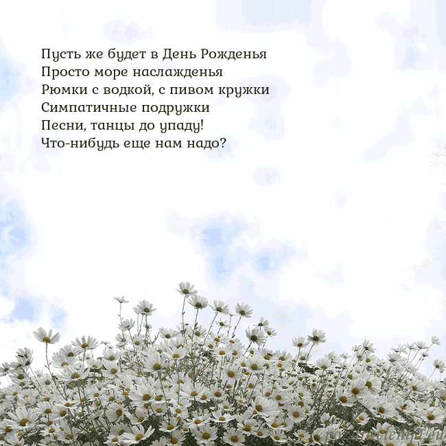 Пусть же будет в День Рожденья Просто море наслажденья Рюмки