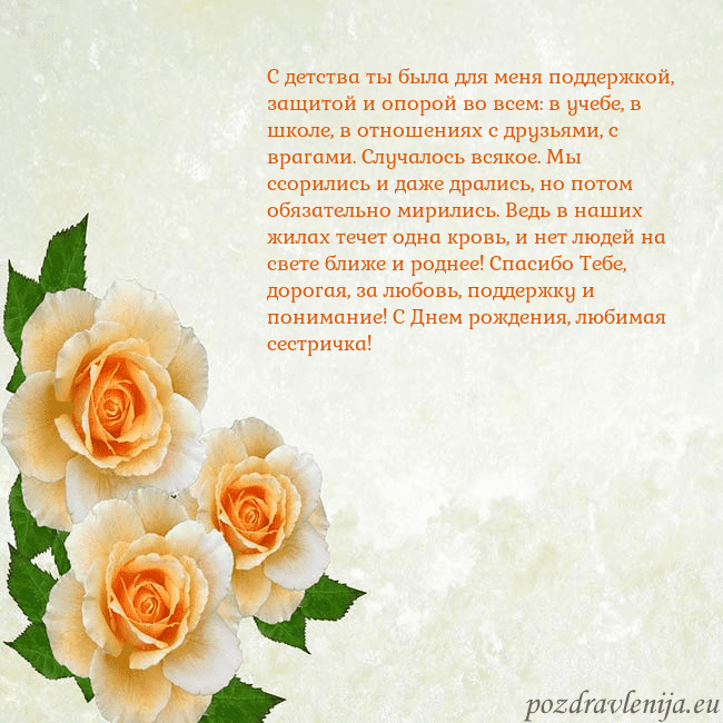 С детства ты была для меня поддержкой, защитой и опорой во всем: в учебе, в школе, в отношениях с друзьями, с врагами. Случалось всякое. Мы ссорились и даже дрались, но потом обязательно мирились. Ведь в наших жилах течет одна кровь, и нет людей на свете ближе и роднее! Спасибо Тебе, дорогая, за любовь, поддержку и понимание! С Днем рождения, любимая сестричка!