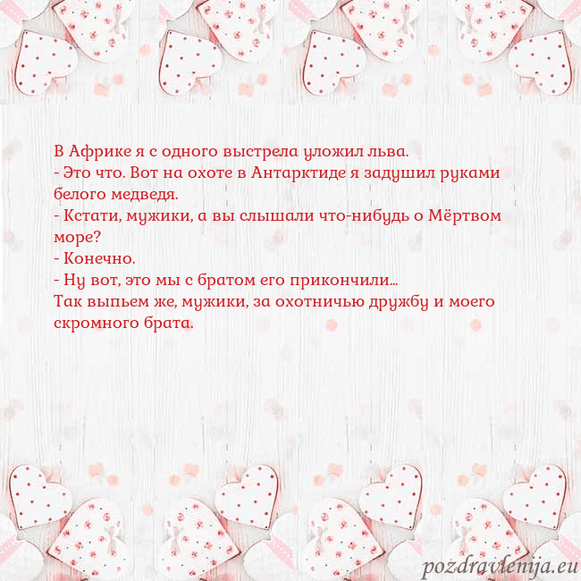 Так выпьем же, мужики, за охотничью дружбу и моего скромного брата.