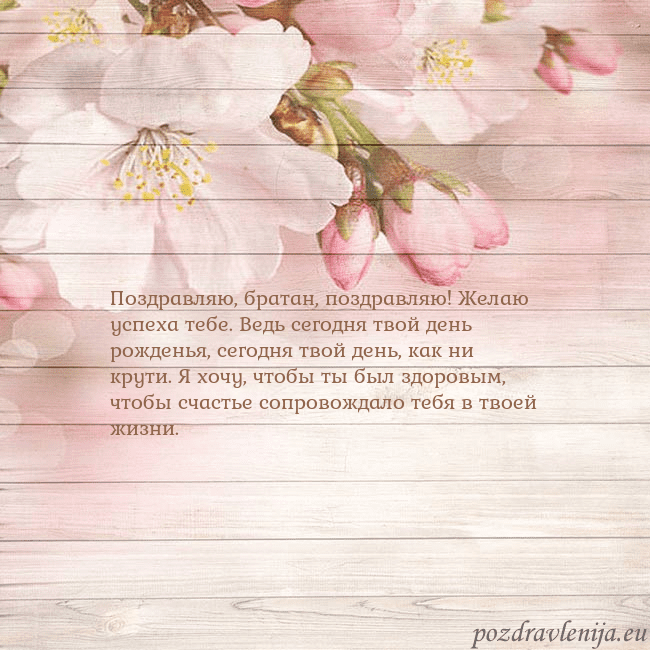 Поздравляю, братан, поздравляю! Желаю успеха тебе. Ведь сегодня твой день рожденья, сегодня твой день, как ни крути. Я хочу, чтобы ты был здоровым, чтобы счастье сопровождало тебя в твоей жизни.