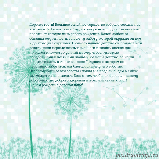 Дорогие гости! Большое семейное торжество собрало сегодня нас всех вместе. Глава семейства, его опора — наш дорогой папочка празднует сегодня день своего рождения. Какой любовью обязаны ему мы, дети, за всю ту заботу, которой окружил он нас и до этого дня окружает. С самого нашего детства он помогал нам делать наши первые неопытные шаги в жизни, опекал нас, прилагал множество усилий к тому, чтобы мы стали порядочными и честными людьми. За наше детство, за наши успехи сегодня, а также за наше будущее, о котором он неустанно заботится, мы благодарны ему, его заботам. Отблагодарить за эти заботы сполна мы вряд ли будем в силах, мы можем только молить Бога о том, чтобы он даровал нашему дорогому отцу доброго здоровья и всех жизненных благ!