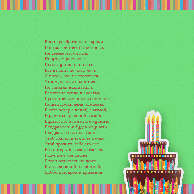 Вновь разбросаны игрушки- Вот уж три годка Настюшке; Не