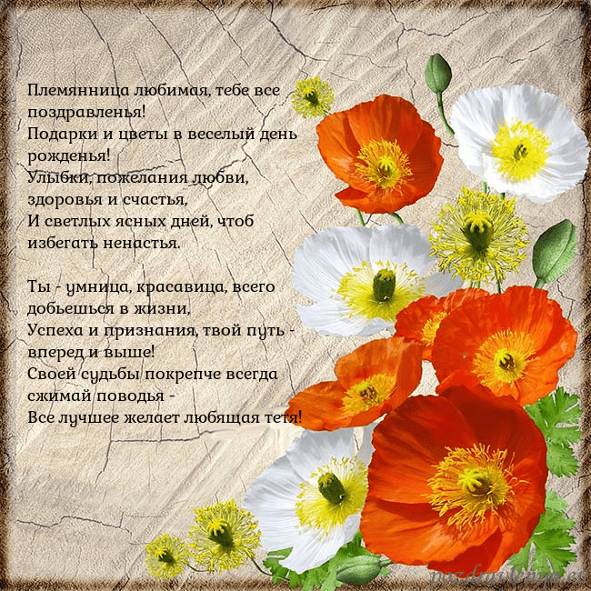 Племянница любимая, тебе все поздравленья! Подарки и цветы в