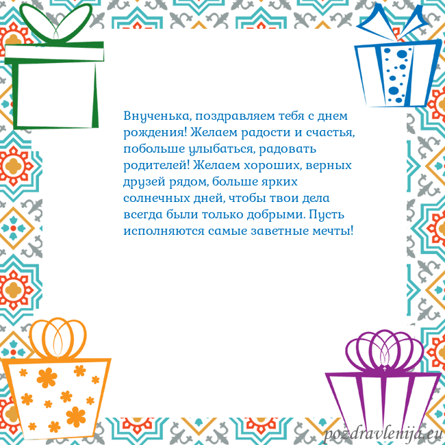 Внученька, поздравляем тебя с днем рождения! Желаем радости и счастья, побольше улыбаться, радовать родителей! Желаем хороших, верных друзей рядом, больше ярких солнечных дней, чтобы твои дела всегда были только добрыми. Пусть исполняются самые заветные мечты!