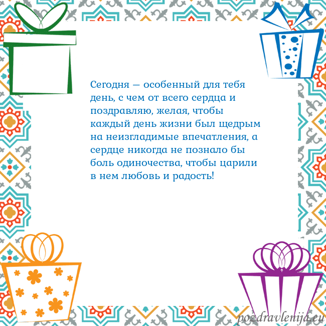 Сегодня – особенный для тебя день, с чем от всего сердца и поздравляю, желая, чтобы каждый день жизни был щедрым на неизгладимые впечатления, а сердце никогда не познало бы боль одиночества, чтобы царили в нем любовь и радость!