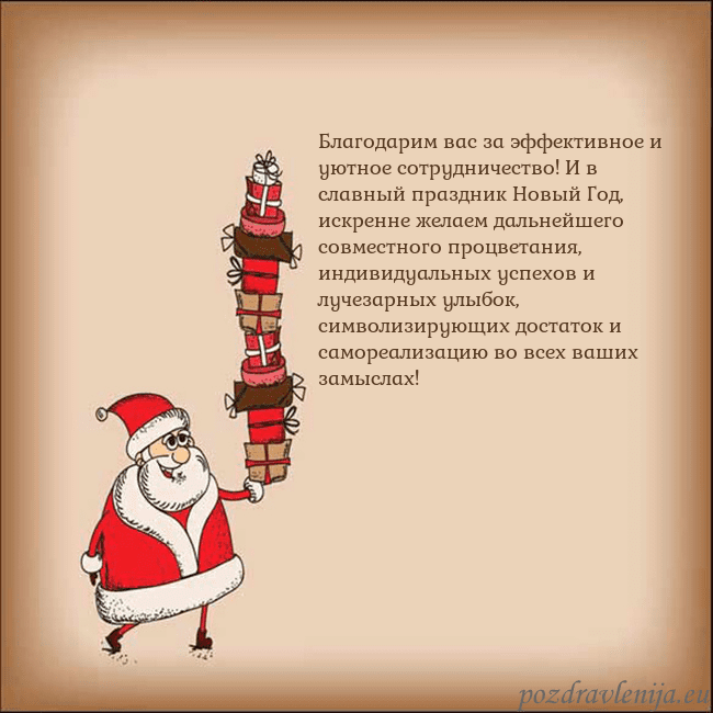 Благодарим вас за эффективное и уютное сотрудничество! И в славный праздник Новый Год, искренне желаем дальнейшего совместного процветания, индивидуальных успехов и лучезарных улыбок, символизирующих достаток и самореализацию во всех ваших замыслах!