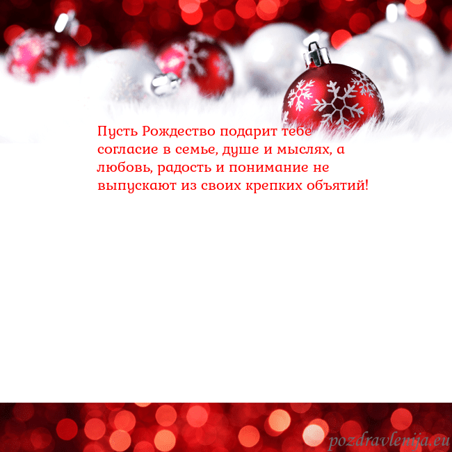 Пусть Рождество подарит тебе согласие в семье, душе и мыслях, а любовь, радость и понимание не выпускают из своих крепких объятий!